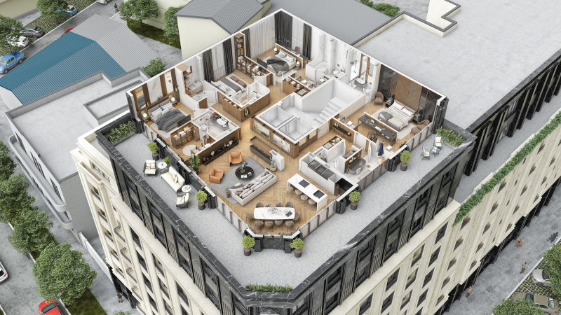U osnovi je projektovan kao petosoban stan od 200m², sa prostranim salonom i luksuznom master spavaćom sobom. Ceo penthaus krasi ugaona terasa od ukupno 65m². Na vrhu Palate Cvijićeva, nalazi se krovno dvorište površine 200m², u kojoj ćemo za Vas kreirati privatnu oazu, sa svim dodatnim sadržajima, što sve ukupno čini impozantnih 465m² korisnog prostora čiste ekstravagancije pod nebom.