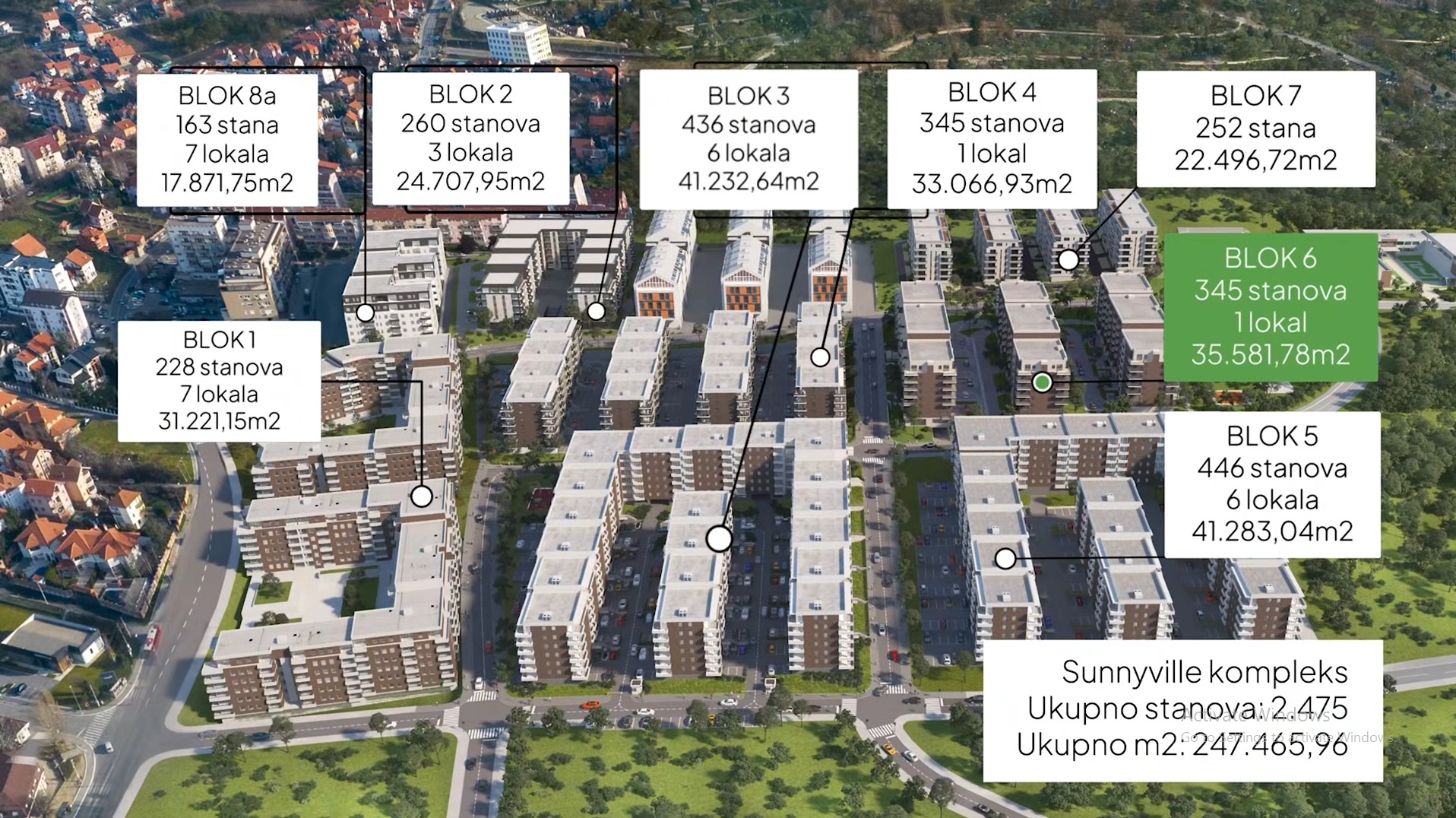 Kompleksu Sunnyville, smeštenom u mirnom kraju Višnjičke banje. Ovo naselje, ukupne površine od 247.465 m2, pruža svojim stanarima fantastičan pogled na Dunav i nudi raznovrsne dodatne sadržaje. Projekat Sunnyville obezbedio je bogate sadržaje za ovaj deo grada. Sunnyville je ne samo moderno i estetski privlačno naselje, već i oaza mira daleko od gradske gužve. Njegova atraktivna lokacija pruža idealan ambijent za savremen i udoban način života. Cena kvadrata već od 1970€ po m2 + PDV